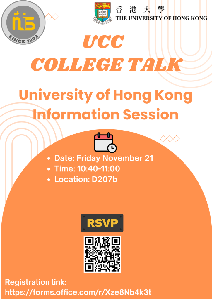 If you have applied or are planning to apply to University of Hong Kong, Please come to D207b during Friday break time for a Q&A session with the HKU admissions officer. Thank you.